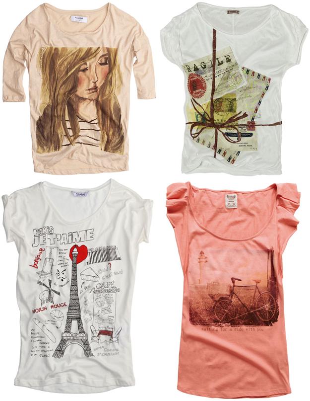 já tenho algumas t-shirts ou com mensagem ou com desenhos e aplicações, largas, L de preferência para ficarem completamente soltas e de ombro caído! regra geral são baratas e com umas jeans mais largas, com dobras e sabrinas, ou com umas skinny jeans , ou até com uns shorts de ganga, ficam fantásticas! tenho uma da lefties que me custou 5,95€ e é um mimo, tem um laço de renda preto que lhe dá muita graça! ficam algumas propostas que eu gosto. acho que umas 2 ou 3 vão aprender o caminho cá para casa....